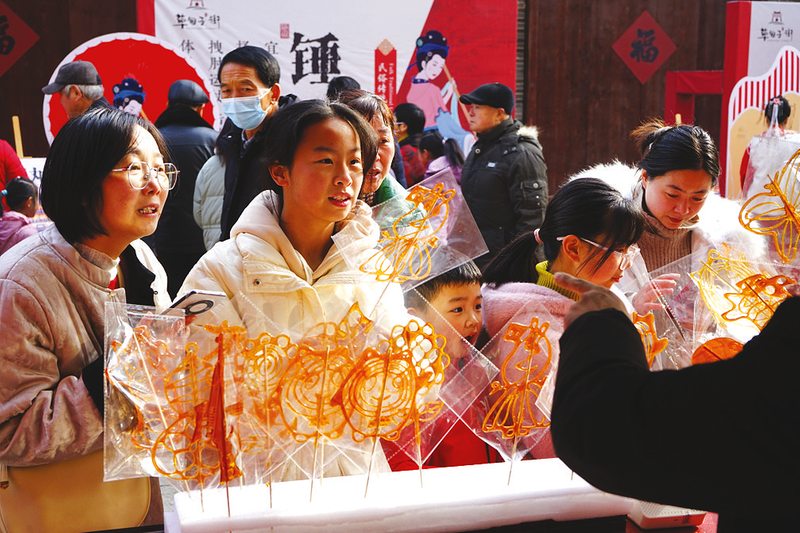 現場活動豐富多元,街道兩邊傳統手藝人現場展示著剪紙、糖畫、竹雕、根雕等精妙技藝,游客們拿著集章手冊體驗射箭、投壺、蹴鞠等傳統活動,還有書法家們現場揮毫潑墨,免費贈予新春對聯,讓游客們體驗到民俗的獨特魅力,感受城市深厚的文化底蘊。