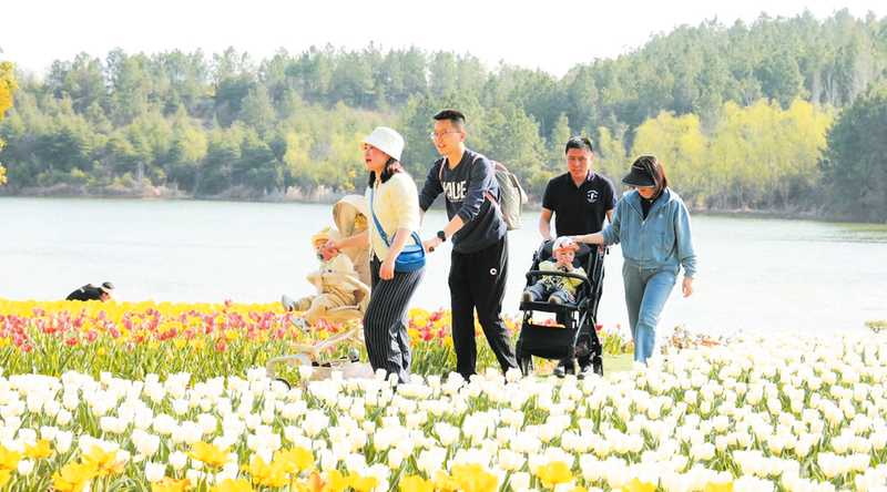 讓文旅春天一路繁花 走進炎帝故里景區,九龍島百花園的近萬株郁金香競相開放,紅、黃、白等各色花朵交織成一幅如夢如幻的畫卷。