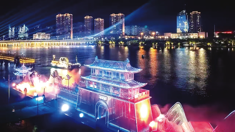 夜幕降臨,白云湖沿岸華燈初上,一場以“云湖夜瀾”為主題的水上視聽盛宴徐徐展開。該項目以隨州歷史文化為脈絡,融合聲光電現代科技,在360度觀光游船上演繹“炎帝長歌”“鐘鳴天地”“隋風宋韻”“時代隨想”四大篇章,為游客帶來沉浸式文化體驗。“回到家鄉,發現城市的夜景越來越美,生活也更加多彩!”從外地返鄉的王先生贊嘆道。