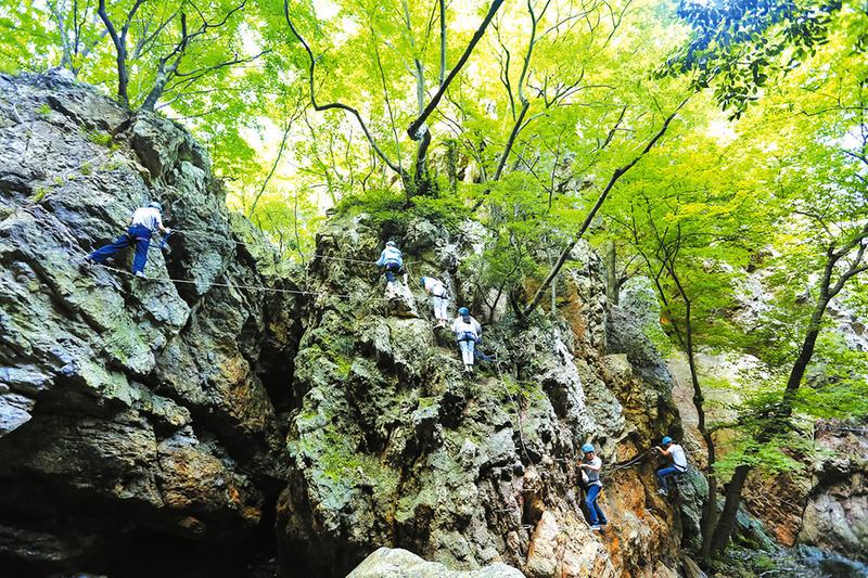 ????綠林古道因漢代綠林起義軍曾在此活動而得名,自筱泉灣度假村至兩王洞,全長約3千米。整條游步道集險、俊、奇、秀于一體,是一處具有原始美、野性美的景點。這里古木參天,老藤攀緣,磬石橫臥,流水飛瀑,顯得十分幽深,是探秘原始森林、放松心情的好去處。這里,獨石成峰,獨木成林,峰林交錯,任由大自然的鬼斧神工,天地之造化。這里,每一塊石,都顯示著滄桑;每一棵樹,都展示頑強。樹莖的堅韌、蒼老,已被深深地鏤刻在石縫間隙。