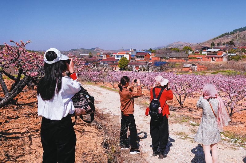 桃林間,游客絡(luò)繹不絕。有的俯身輕嗅花香,沉醉其中;有的高舉手機(jī),與嬌艷桃花“同框”留念,歡聲笑語(yǔ)在繽紛春色中回蕩。“我們特意從武漢開車過來,一路桃花相伴,美不勝收。這里空氣清新,身處花海,心情格外舒暢,這一趟太值得了!”武漢游客王麗霞滿臉喜悅,興奮地分享著自己的感受。