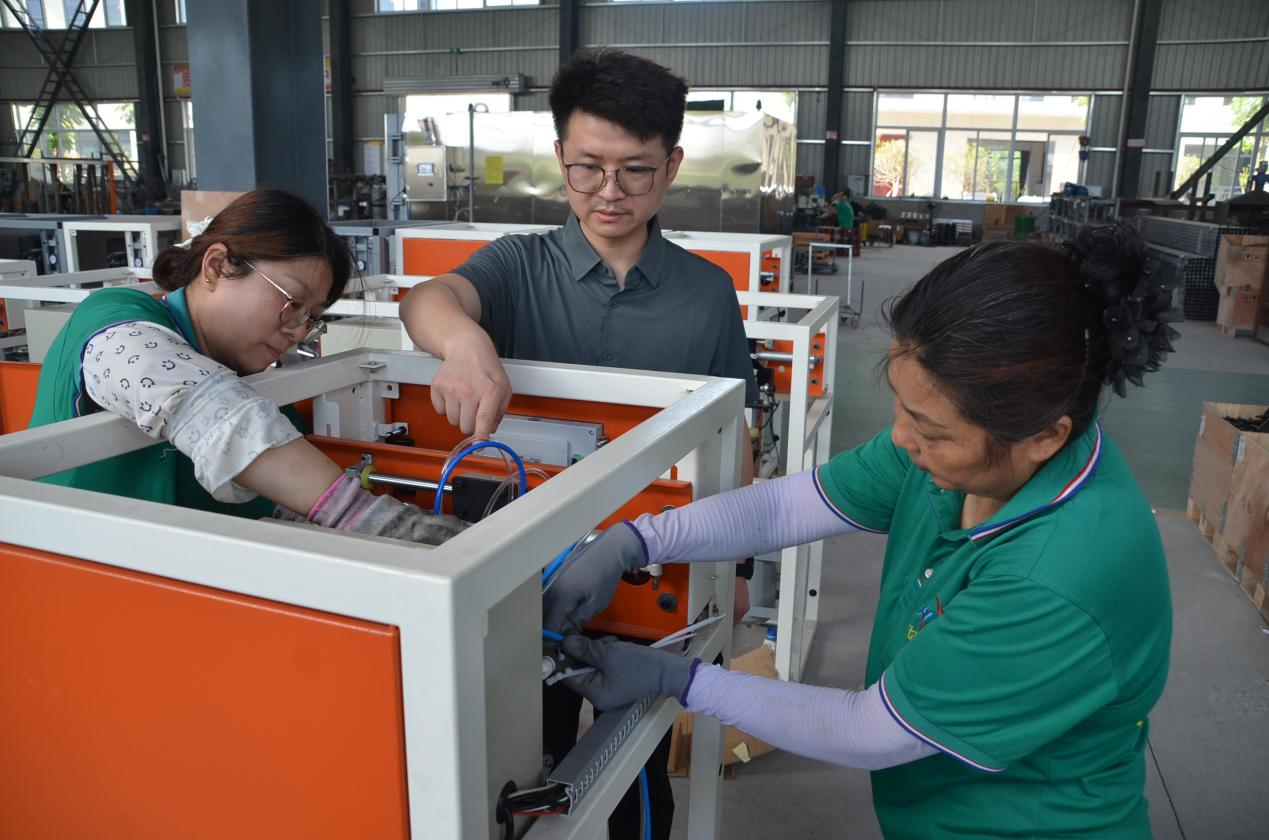 圖為湖北扶星農業機械有限公司總經理周沖(右二),指導工人組裝機件。