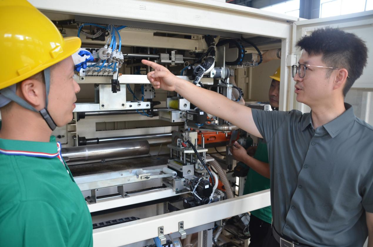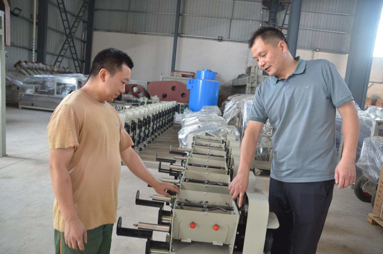 圖為湖北杰博食用菌設備有限公司總經理程海杰(右),和工人交流進一步改進設備結構。
