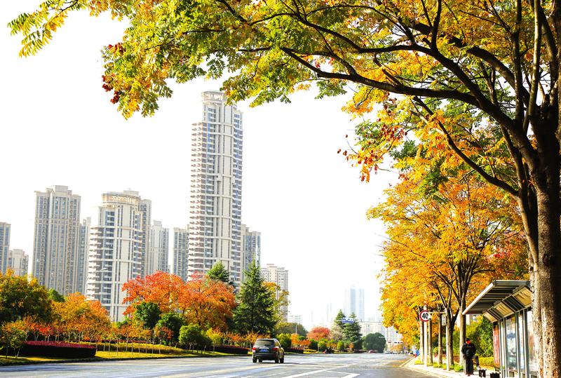 初冬時節(jié),隨州城區(qū)層林盡染,法桐、銀杏和欒樹樹葉金黃透亮、鮮艷奪目,將城市裝扮得分外美麗。圖為迎賓大道城區(qū)段景觀。