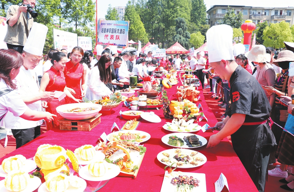 5月11日,隨州市“銀杏杯”特色風(fēng)味美食大賽在神農(nóng)公園開幕。來自全市60多家餐飲企業(yè)的大廚們?yōu)槭忻衽笥讯松狭?0多道特色菜,吸引眾多市民拍照留念。大賽還評選出十大名店、十大名師、菜。