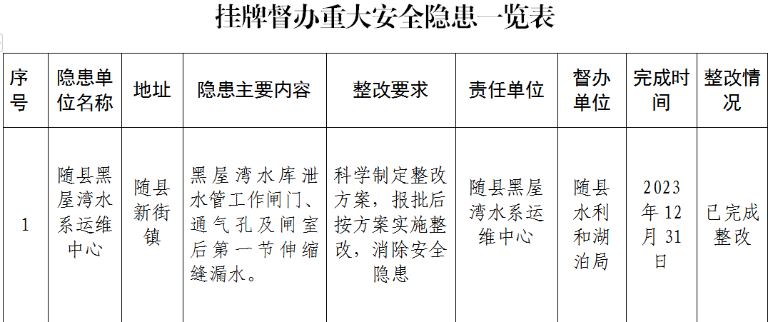 根據《關于對黑屋灣水庫泄水管重大安全隱患進行掛牌督辦的通知》,市水利和湖泊局黑屋灣水庫泄水管重大安全隱患進行了掛牌督辦。經過整改責任單位按要求整治,隨縣水利和湖泊局經檢查驗收后向市水利和湖泊局報送了銷號申請。