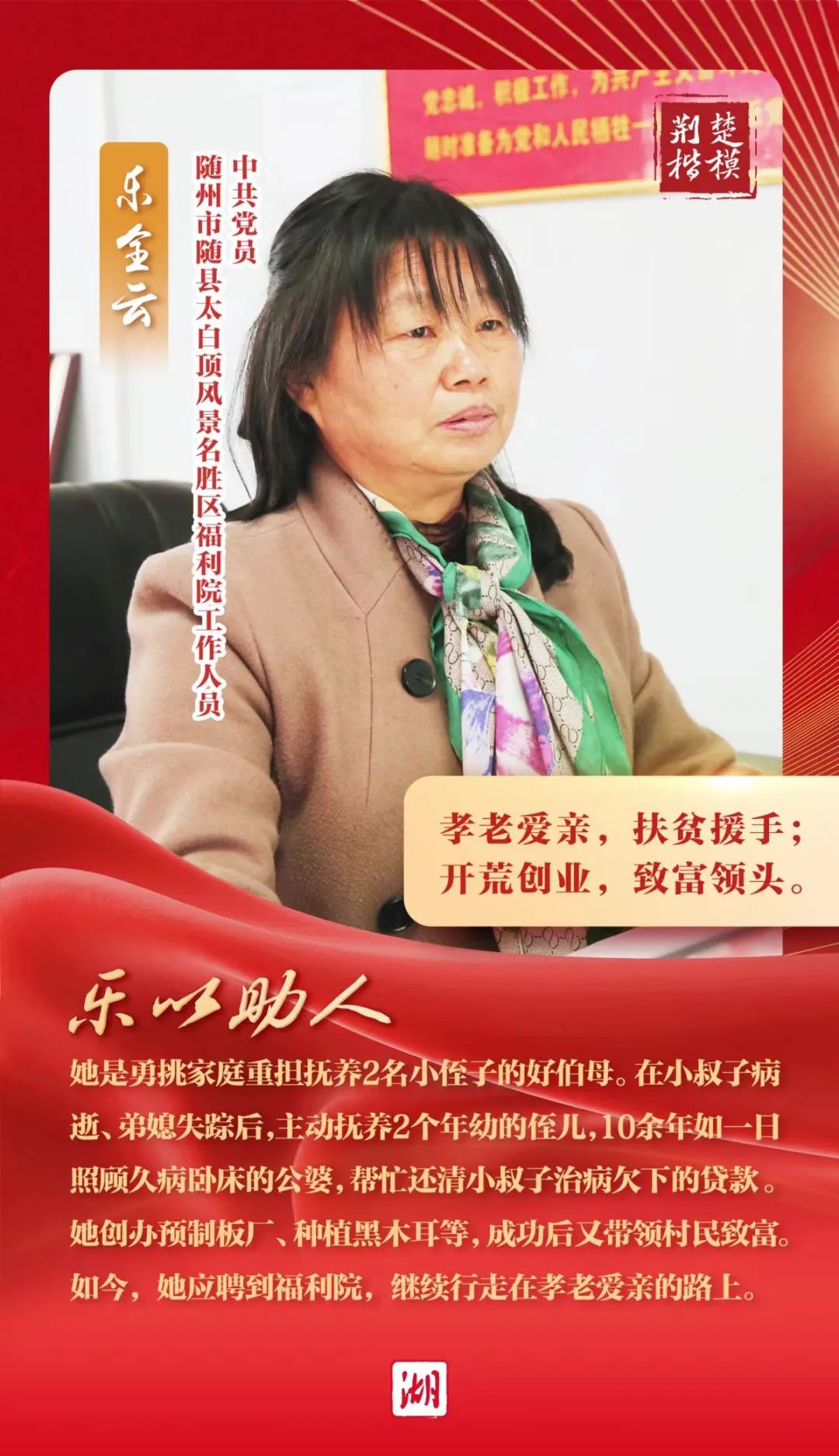 勤勞善良的樂全云,始終牢記自己黨員身份,帶領(lǐng)10多名貧困村民貸款發(fā)展產(chǎn)業(yè),幫助村民創(chuàng)收500余萬元。現(xiàn)在,退休的樂全云又應(yīng)聘到當(dāng)?shù)馗@海疹櫣鹿牙先耍^續(xù)行走在孝老愛親的路上。
