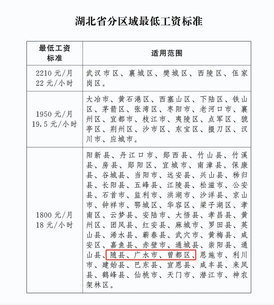 湖北省第一檔月最低工資標準為2210元,第一檔小時最低工資標準為22元。