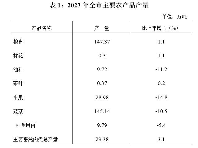 ? ? ? 全年實現農林牧漁業增加值209.63億元,按可比價格計算,比上年增長4.0%。糧食種植面積211.23千公頃,增長0.7%;棉花種植面積3.71千公頃,下降4.0%;油料種植面積42.79千公頃,下降2.4%。糧食總產量147.37萬噸,增長1.1%;棉花總產量0.3萬噸,增長1.1%;油料產量9.72萬噸,下降11.2%。完成人工造林0.93千公頃。