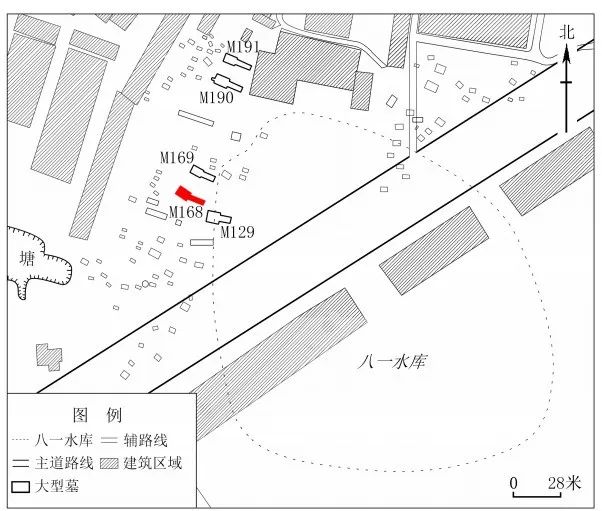 棗樹林墓地隸屬于義地崗墓群,是墓群南部諸多小墓地之一,位于湖北省隨州市曾都區(qū)東城辦事處文峰社區(qū)面積約6萬(wàn)平方米。2018年6月,經(jīng)國(guó)家文物局批準(zhǔn),湖北省文物考古研究所(現(xiàn)湖北省文物考古研究院)對(duì)之前勘探發(fā)現(xiàn)的墓葬及馬坑、車坑進(jìn)行考古發(fā)掘,共發(fā)掘墓葬86座,馬坑、車馬坑7座。其中M168位于棗樹林墓地中部(圖二),是墓地5座大型墓葬之一,共出土銅、陶、玉石、鉛錫等隨葬器物123件(套)。