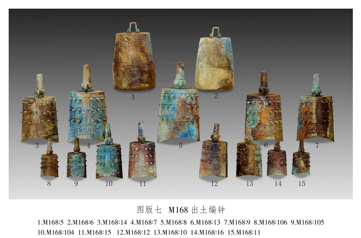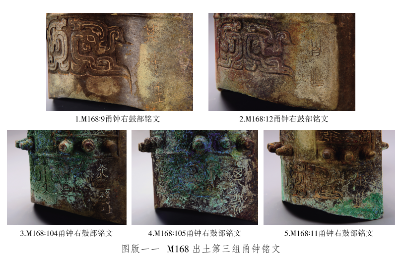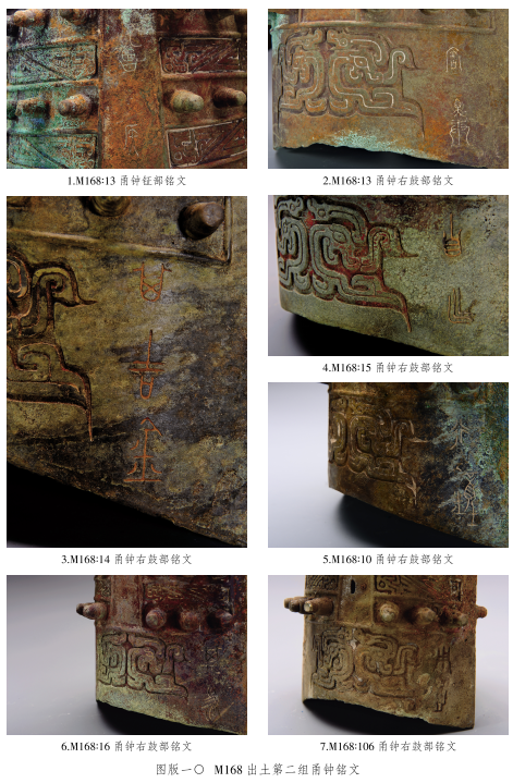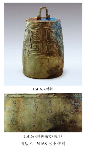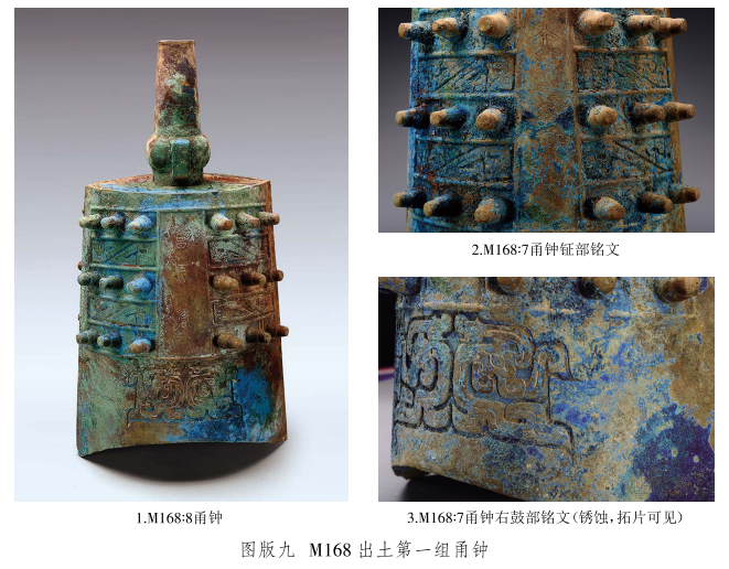 山之金,曾公用斿”,說(shuō)明曾國(guó)銅料來(lái)源于某座大山,為揭示曾國(guó)銅料來(lái)源提供了新線索。M168共出土隨葬器物123件(套)(不完全統(tǒng)計(jì),部分提取樣品正在實(shí)驗(yàn)室清理中),可分為銅、玉石器兩大類,下文按質(zhì)地分類予以介紹。為便于區(qū)分及介紹,下文對(duì)墓葬盜洞內(nèi)出土器物編號(hào)前加數(shù)字0。近年,墓葬被盜器物部分在公安等部門的大力支持配合下,被追回收繳,亦有部分被私家收藏。其中,樂(lè)器出土15件。器類有镈鐘、甬鐘兩種。镈鐘 2件。正面鼓部鑄銘五行15字,自左至右讀作:“曾侯寶擇其吉金自作行鐘其永用之”。出土甬鐘 13件。綜合編鐘大小、銘文內(nèi)容、字體及出土位置,可將13件出土甬鐘分為3組,第一組2件,第二組6件,第三組5件。?M168∶8,正面鉦部鑄銘一行3字:“曾侯寶”,右鼓部鑄銘二行6字:“擇其吉金自作”。M168∶7,正面鉦部鑄銘一行3字:“行鐘其”(圖版九,2),正面右鼓部鑄銘一行3字:“永用之”(圖版九,3)。M168∶13,正面鉦部鑄銘一行2字:“曾侯”,正面右鼓部鑄銘1行2字:“寶擇”。M168∶14,正面右鼓部鑄銘一行3字:“其吉金”(圖版一〇,3)。