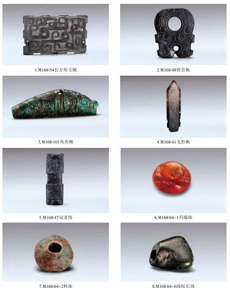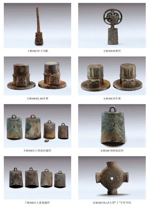 M168∶11,正面右鼓部鑄銘一行2字:“用之”(圖版一一,5)。另外出土車馬器51件(套)馬銜鑣、車軎、鑾鈴、編鈴、軛足、節(jié)約、鋂;玉石器佩、沖牙、玦、環(huán)、塞、管、戈、編磬等。另外還出土了兵器,陶器等。棗樹林墓地發(fā)掘了兩組曾侯夫婦合葬墓,即M190、M191與M168、M169,根據(jù)發(fā)掘情況及墓葬隨葬器物特征看,M190與M168墓主是前后相繼的兩位曾侯,M190的年代在公元前650年左右,M168的年代要晚于公元前650年。M169羋加編鐘銘文記載:“嗚呼,龔公早陟……”,說(shuō)明M168墓主去世較M169羋加早,羋加編鐘的年代大概在公元前623年,故M168年代當(dāng)早于公元前623年。根據(jù)隨葬器物形制特征及相關(guān)銅器銘文,推測(cè)M168的年代為春秋中期早晚段之間,約為公元前650~前623年。通過(guò)墓葬考古出土器物結(jié)合被盜傳世器物,可以基本推定曾侯寶墓隨葬器物組合,對(duì)研究春秋中期諸侯墓葬隨葬禮制提供了新材料;M168隨葬器物兼具周楚文化特征,對(duì)研究曾、楚、周三者之間的文化交流與融合具有重要意義。