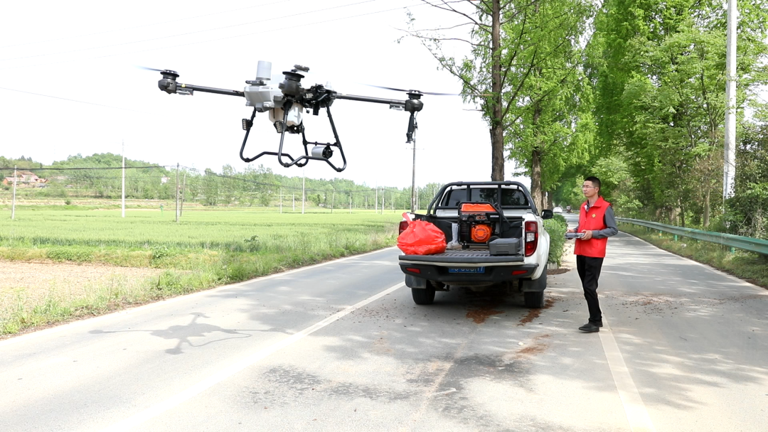 “無人機在進行農作物病蟲草害統防統治和飛播飛種時,作業速度可達7米/秒,每天作業面積高達600畝。”隨縣供銷社植保飛防大隊隊長向升介紹,“該無人機除噴灑農藥以外,還具備撒肥、播種等功能。今年,隨縣供銷社新購置了16臺大疆T25、T60型號植保無人機,全系統已擁有植保無人機40臺、合格的無人機操作手50名,飛防服務范圍基本覆蓋全縣所有鄉鎮。”