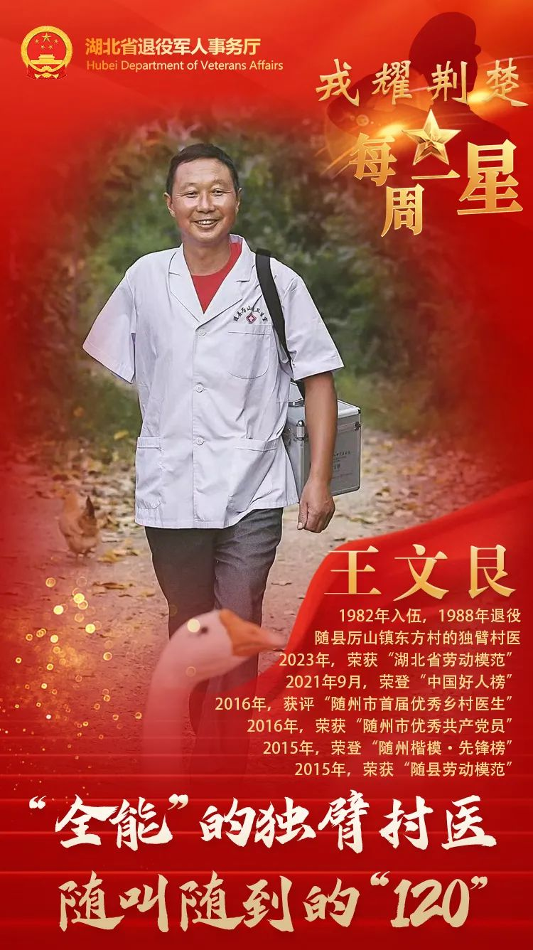 據了解,王文艮在1988年退役后,成為了隨縣厲山鎮東方村的一名村醫,后來,因患骨癌截去右臂,36年來,他扎根村醫崗位,靠著一只左臂、一個醫藥箱,守護著方圓14平方公里、800余戶、3000余名村民的健康,無論白天黑夜,刮風下雨,只要村民一個電話,他便及時趕到,被村民稱為隨叫隨到的“120”。