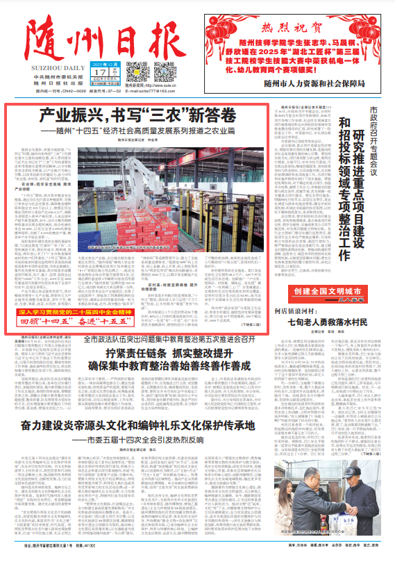 今年是“十四五”規(guī)劃收官之年,高質(zhì)量完成“十四五目標(biāo)任務(wù),為實現(xiàn)“十五五”良好開局打牢基礎(chǔ),意義重大。為全面展現(xiàn)全市上下牢牢把握發(fā)展定位,統(tǒng)籌發(fā)展與安全,推動“十四五”規(guī)劃落地見效的生動實踐和亮點成果,同時反映我市各地各部門深入學(xué)習(xí)貫徹黨的二十屆四中全會精神,科學(xué)謀劃“十五五”發(fā)展的思路舉措,隨州日報推出“回顧十四五、奮進十五五”系列報道,敬請關(guān)注。
