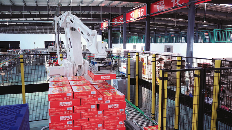 品源現(xiàn)代車間內(nèi),機械臂正在搬運打包完畢的香菇醬產(chǎn)品