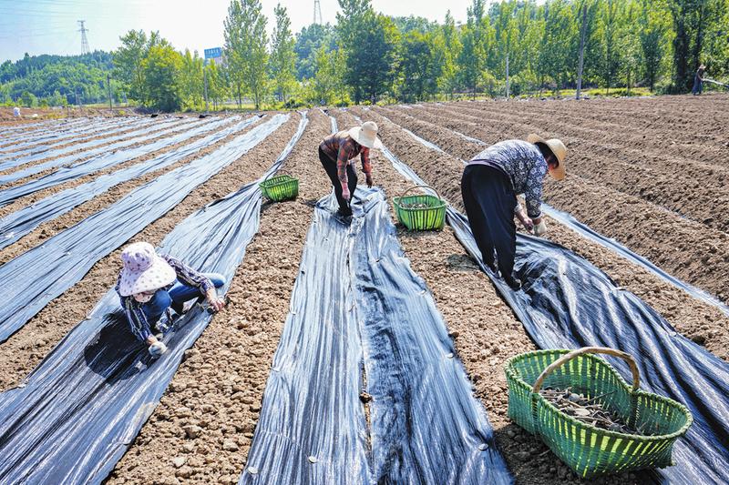 在隨縣萬和鎮(zhèn)黃林樹村,中藥材種植正蓬勃發(fā)展。5月8日,該村藥農(nóng)們正在辛勤勞作,為播種的中藥材白薟覆膜。