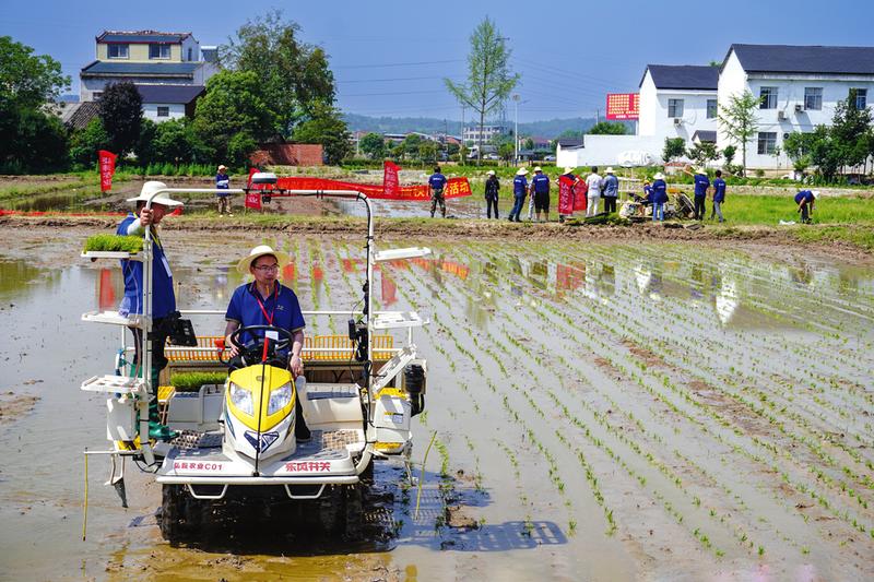 5月14日,2024年隨州市“東風井關杯”殘疾人高速插秧機操作技能比賽在隨縣安居鎮弘耘農業發展有限公司舉行。圖為插秧機田間插秧作業比賽現場。