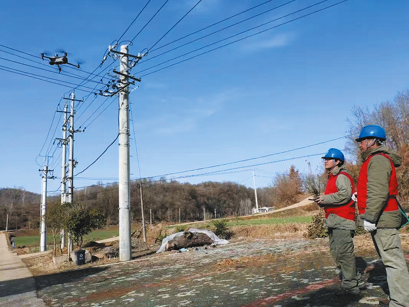 連日來,國網隨州供電公司以“滿格電”助企“開門紅”。圖為該公司服務隊隊員對電網開展無人機安全巡查。