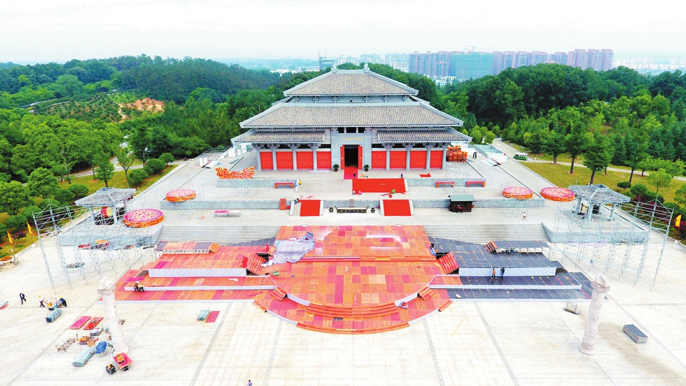 ? ? ? ?己亥年世界華人炎帝故里尋根節(jié)即將在隨州舉行,日前各項準(zhǔn)備工作正在緊鑼密鼓進(jìn)行中。圖為5月21日炎帝故里景區(qū)謁祖廣場,工人們正在搭建拜祖大典的舞臺。