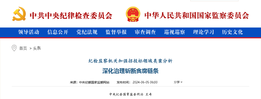6月5日,中央紀委國家監委網站發布文章《紀檢監察機關加強招投標領域類案分析 深化治理斬斷貪腐鏈條》,通過西藏自治區、安徽省、黑龍江省、重慶市、寧波市、青島市、南昌市等地紀檢監察機關的招投標領域類案分析,明確整改措施,制定完善規章制度。