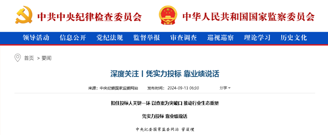 9月13日,中央紀委國家監委網站發布文章《憑實力投標 靠業績說話》,提出紀檢監察機關要強化日常監管,督促主管部門加強標前、標中及標后管理,推動行業生態重塑。