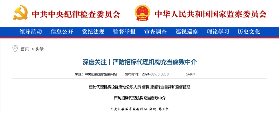 8月30日,中央紀委國家監委網站發布文章《嚴防招標代理機構充當腐敗中介》,督促要加強行業自律和監督管理,確保招投標活動規范進行。