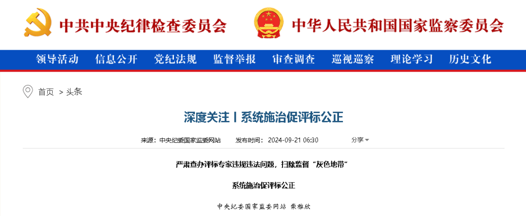 9月21日,中央紀委國家監委網站發布文章《系統施治促評標公正》,提出要建設更加有序的招標投標市場,須抓住規范評標專家管理這個關鍵。