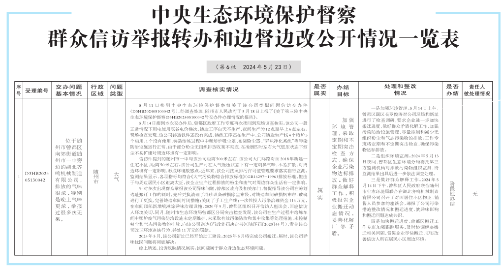 中央生態環境保護督察群眾信訪舉報轉辦和邊督邊改公開情況一覽表