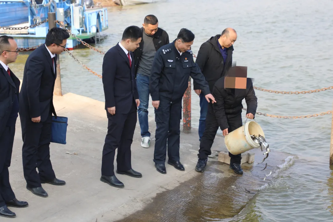 隨州市曾都區(qū)檢察院辦案人員與漁政管理部門人員一起監(jiān)督涉案人員在曾都區(qū)萬店鎮(zhèn)先覺廟水庫開展增殖放流活動