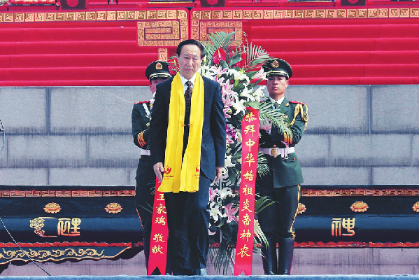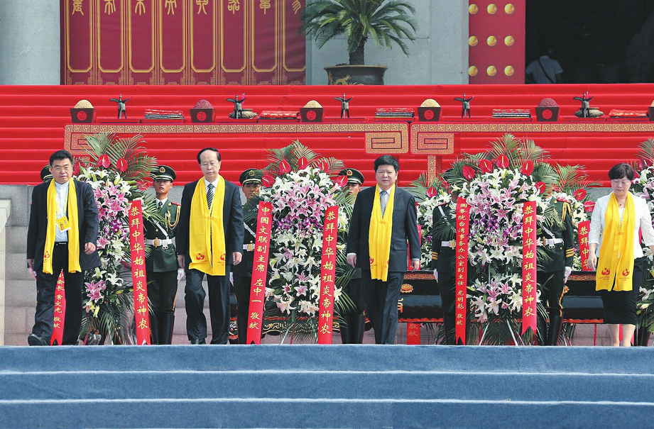 ? ? 國務院臺灣事務辦公室副主任龍明彪、中國文聯(lián)副主席左中一、中華全國歸國 ? 華僑聯(lián)合會副主席康曉萍、中華炎黃文化研究會常務副會長常文光敬獻花籃