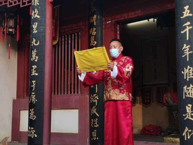 5月17日上午,庚子年炎帝文化廟會舉行請圣儀式。在大司儀的主持下,由九名司禮組成的請圣隊伍依次凈手、上貢品、上高香、敬酒之后,行三叩九拜大禮。