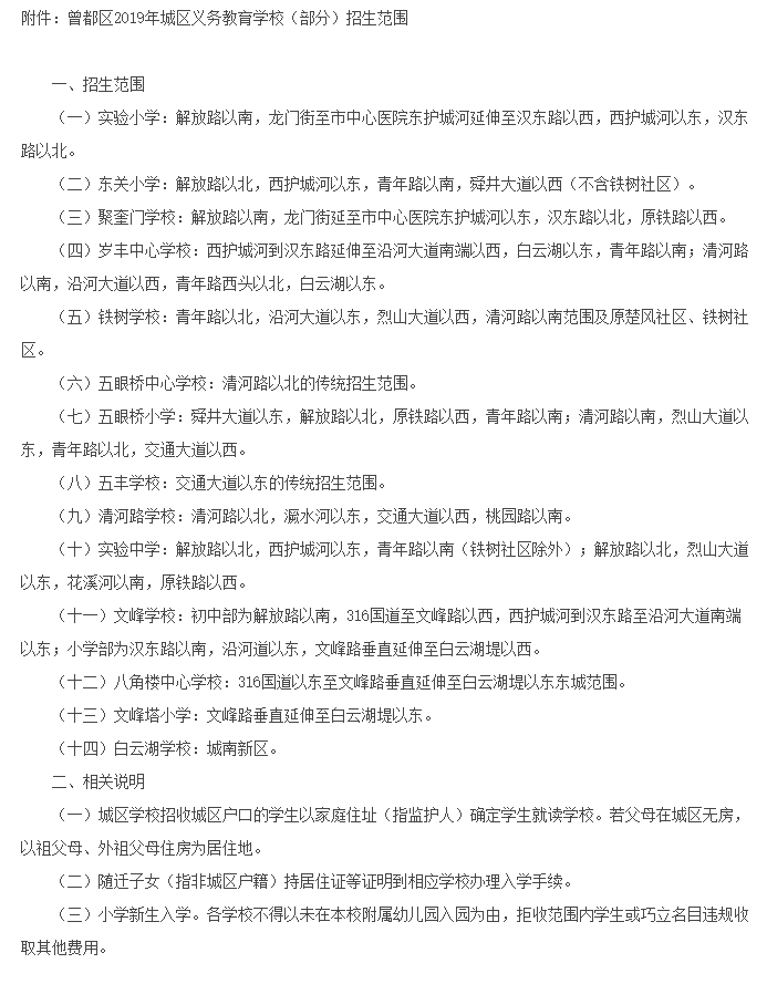 隨州市曾都區2019年城區義務教育學校(部分)招生范圍