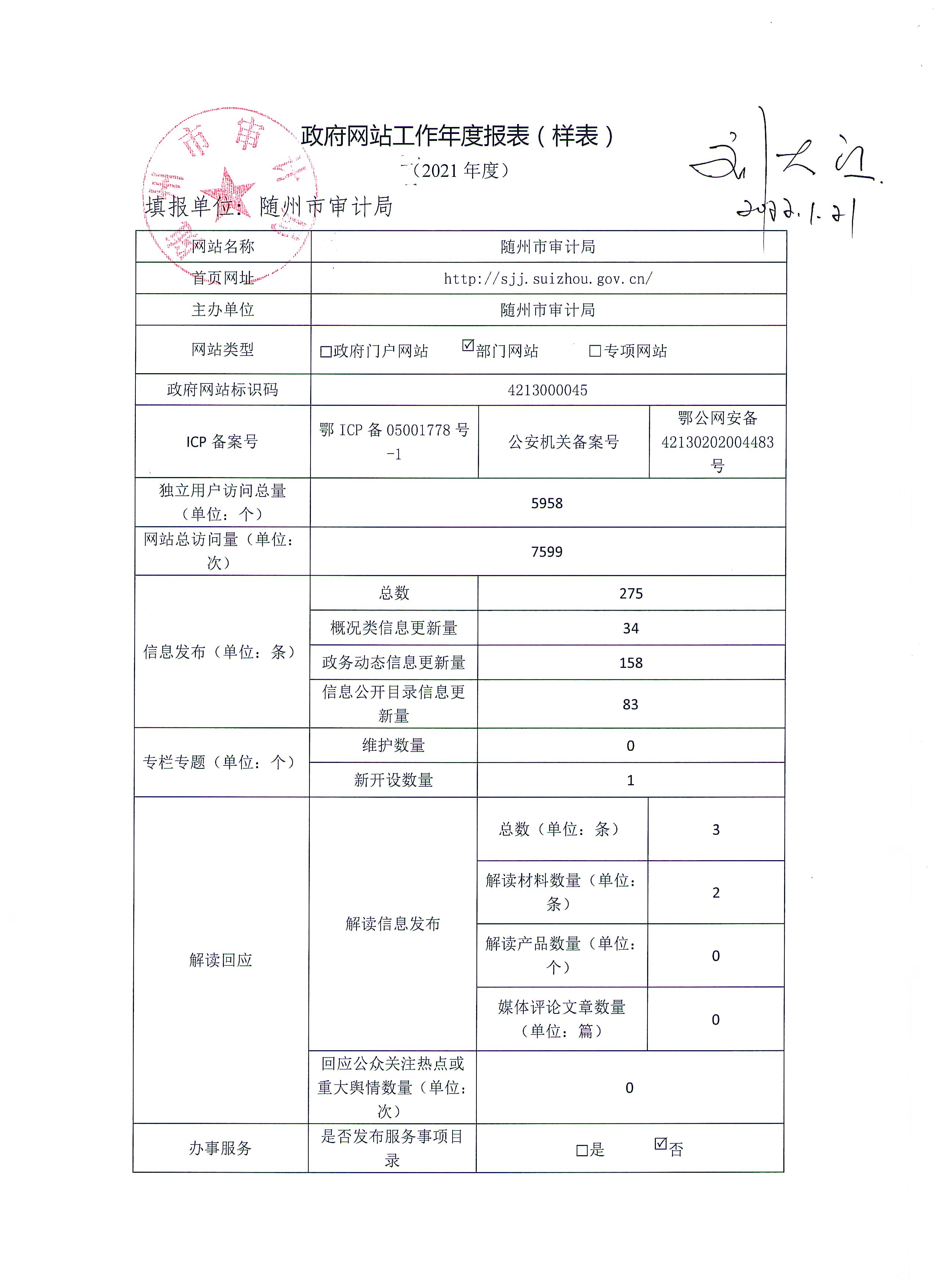 隨州市審計(jì)局2021年政府網(wǎng)站工作年度報(bào)表