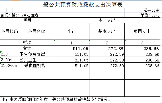 1.衛生健康(類)公共衛生(款)采供血機構(項)。年初預算為511.05萬元,支出決算為511.05萬元,完成年初預算的100%。