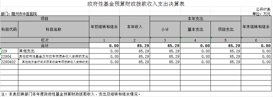 (一)其他支出(類)其他政府性基金及對應專項債務收入安排的支出(款)其他地方自行試點項目收益專項債券收入安排的支出(項)。支出決算為85.29萬元,主要用于中醫醫院新院建設政府基金財政撥款支出。