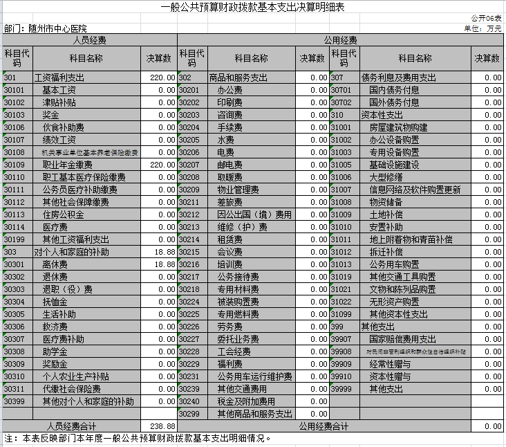 9.衛生健康支出(類)公立醫院(款)綜合醫院(項)。年初預算為 ?238.88 萬元,支出決算為238.88萬元,完成年初預算的100 %,其中 220萬元為我院人員補助經費、13.88萬元為離休人員離休費。