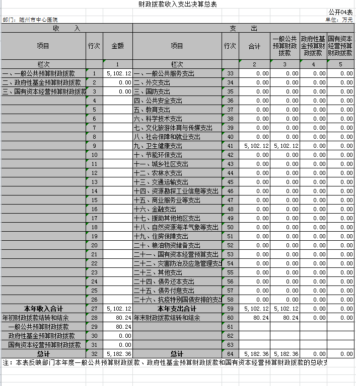 2023年度財政撥款收、支總計均為 5182.36? 萬元。與2022年度相比,財政撥款收、支總計各減少11005.01 萬元,下降212.4 %。主要原因是2022年度收到傳染病醫院項目建設專項債15134.08萬元,2023年度無政府性基金預算收入,因此2023年度財政撥款收支總計比2022年度減少212.4%。