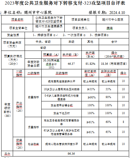 4.公共衛生服務對下轉移支付-323攻堅項目績效自評綜述:項目全年預算數為0萬元,執行數為46.37萬元,完成預算的100%。主要產出和效益:一是18歲及以上居民高血壓知曉率≥55%;二是0-6歲兒童眼保健和視力檢查覆蓋率≥90%;三是高血壓患者基層規范管理服務率≥61%;四是65歲及以上老年人城鄉社區規范健康管理服務率≥61%。發現的問題及原因:未完成年初資金預算目標,部分經費未使用完畢,預算執行率較低。下一步改進措施:及時使用項目資金,保證項目資金使用合理合規,提高心腦血管疾病篩查水平。