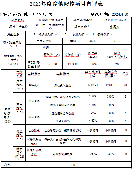 1. 重大傳染病防控項目績效自評綜述:項目全年預算數0萬元,執行數44.9萬元,完成預算的100%。主要產出和效益:一是加強了高風險患者應急處置、隨訪及技術指導;二是提高了對病人家屬護理教育和對精防人員的相關培訓;三是完成病例篩查508人,完成率100%;四是高風險患者應急處置40人,完成率100%。發現的問題及原因:未完成年初資金預算目標,部分經費未使用完畢。下一步改進措施:及時使用項目資金,提高重大傳染病防控規范化管理和治療水平。