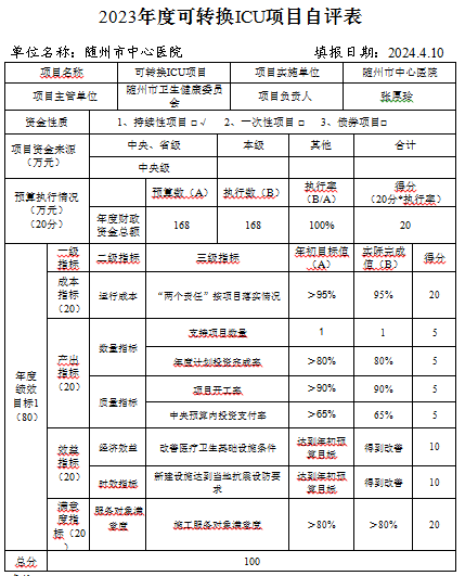 8. 基建支出-可轉換ICU項目績效自評綜述:項目全年預算數為0萬元,執行數為168萬元,完成預算的100%。主要產出和效益:一是“兩個責任”按項目落實情況>95%;二是改善了醫療衛生基礎設施條件;三是中央預算內投資支付率≥65%;四是年度計劃投資完成率≥80%。在項目使用中未發現的問題。