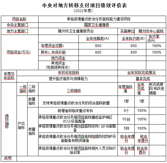 7. 醫療服務與保障能力提升補助資金項目績效自評綜述:項目全年預算數為0萬元,執行數為800萬元,完成預算的100%。主要產出和效益:一是項目完成及時,預算執行率為100%;二是承擔疫情重點救治任務每項目醫院重癥監護病區(ICU)設備配備為10臺;三是承擔疫情重點救治任務每項目醫院院感防控防護設備配備和物資儲備較去年提高;四是承擔疫情重點救治任務每項目醫院相關人員及知識培訓率較去年提高。發現的問題及原因:應對突發公共衛生事件應急能力不足。下一步改進措施:建立健全分級、分層、分流的傳染病救治機制,完善醫療服務體系,提升應對重大疫情防控能力。