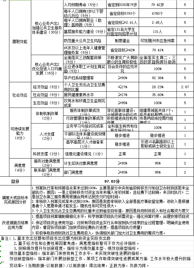 從評價情況來看,隨州市衛生健康委整體支出績效目標基本實現,績效自評得分97.03分,績效等級為優。