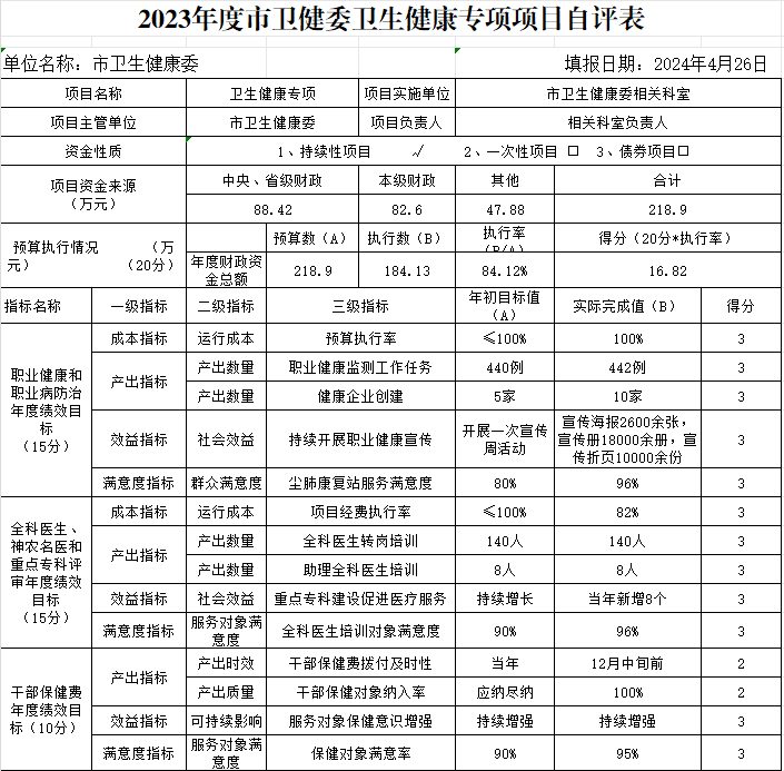 《2023年度市衛健委其他專項經費項目自評表》附后