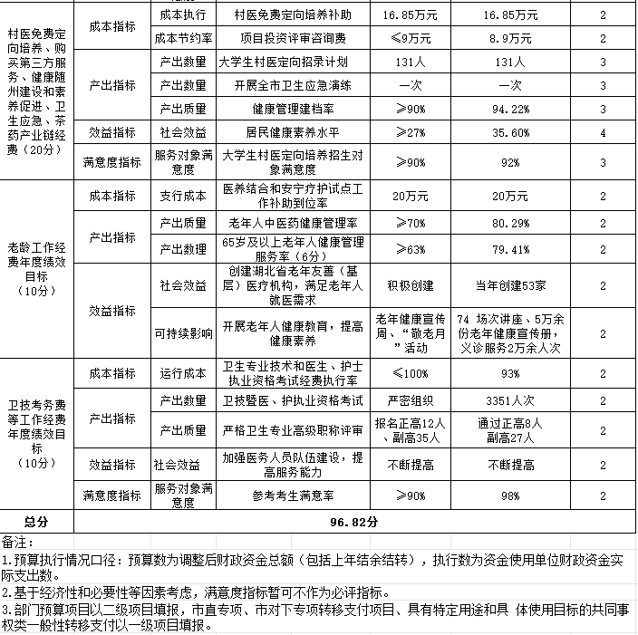2.衛生業務類支出項目績效自評綜述:本項目內含六個子項目,因六個項目經費額度都不大,因此一并統籌進行績效自評。項目全年預算數為218.9萬元,其中:本級財政撥款82.6萬元,上級轉移支付收入88.42萬元,其他收入47.88萬元;實際執行184.13萬元,執行率84.12%。主要產出和效益:一是職業健康和職業病防治項目經費預算執行率達100%,二是村醫免費定向培養補助成本執行100%,三是項目投資評審咨詢費成本節約率0.1%,四是醫養結合和安寧療護試點工作補助到位率100%,五是衛生技術和醫生、護士執業資格考試經費很好的貫徹落實了中央和省市“過緊日子”的工作要求,六是職業健康監測、全科醫生轉崗、助理全科醫生培訓、健康企業創建工作完成省定目標,七是完成當年招收村醫免費定向培養大學生計劃131人,八是老年人中醫藥健康管理率和65歲及以上老年人健康管理服務率超額完成省定目標,九是創建重點???個。發現的問題及原因:一是預算執行率未達到100%,二是績效自評指標和年初目標值不一致;原因是部分項目為延續項目和結合當年工作、考核要求重新設置了指標值。下一步改進措施:一是加強預算執行力度,確保資金使用進度,強化資金使用及時,有力保障資金效益;二是在預算目標設定時,力求結合目標任務和工作計劃全面、科學、精準、規范。