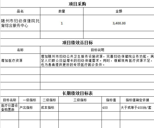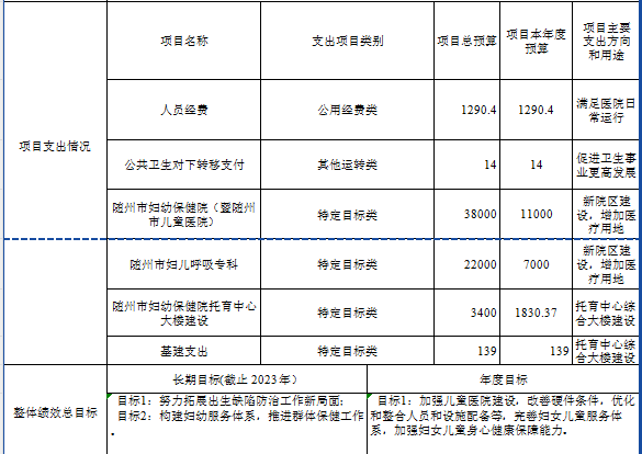 3.項目的績效總目標是增加隨州市婦幼公共衛生服務設施資源,完善婦幼保健院業務功能,滿足人民群眾日益增長的婦幼保健需求。
