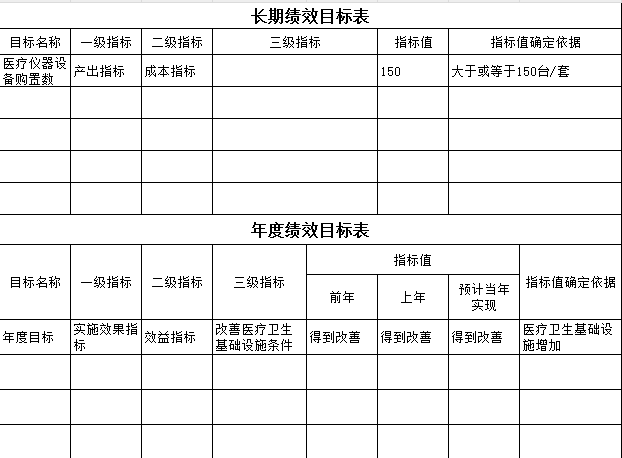 4.年度績效目標是一級指標是實施效果指標,二級指標是效益指標,三級指標是醫療衛生資源配置,預計逐步優化,資源配置增加。