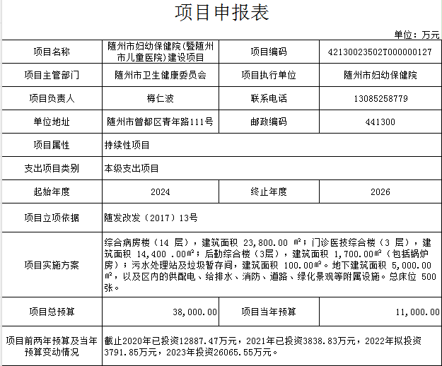 1.2025年預算安排11000萬元,資金來源為單位事業收入資金。2024年隨州市婦幼保健院為了有效開展工作,維護全市婦女兒童的健康,盤活存量資產,我院計劃新建新院,從根本上解決業務用房不足、布局不合理的難題。該項目建設地址為隨州市曾都區蔣家崗社區,位于清河路與鹿鶴大道交會處。計劃用地70畝,總建筑面積4.5萬平方米,其中:地上建筑面積4萬平方米(綜合病房樓2.38萬平方米、門診醫技樓1.44萬平方米、后勤綜合樓0.17萬平方米、污水處理站及垃圾暫存間100平方米);地下室(人防及地下停車)0.5萬平方米。開放病床498張。該項目已在2021年1月20日完成主體封頂,并做好室內深化設計方案,目前正在進行室內裝修。項目建設總投資為3億元,申請中央預算內資金5000萬元,地方配套5000萬元,單位自籌20000萬元。該項目通過產出指標、效益指標、滿意度指標分析,新院建設能增加醫療基礎設施,改善醫療基礎條件,滿足人們日益增長的婦幼需求。項目建成后可從根本上解決隨州市婦幼保健院醫療基礎設施不足的問題,有利于改善該院的基礎設施和醫療設備條件,有利于提高服務水平和確保各項工作順利開展。滿足隨州市婦女兒童保健需求,社會效益好,對婦幼衛生保健事業的發展將產生積極的影響。