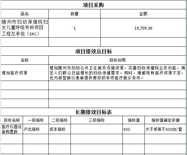 項目績效總目標是增加隨州市婦幼公共衛生服務設施資源,完善婦幼保健院業務功能,滿足人民群眾日益增長的婦幼保健需求。同時,緩解現有醫療資源不足,也為新型肺炎患者提供更好的專項醫療就診條件。
