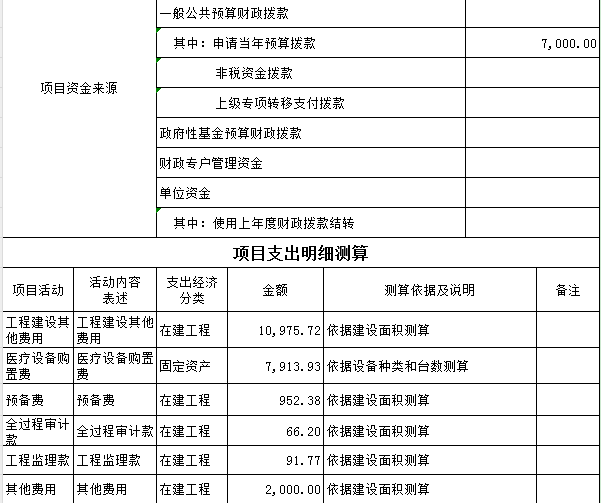 項目支出主要包括主體建筑工程費、公共配套設備工程、人防工程、室外及配套工程、征地補償費、技術咨詢服務費、項目建設管理費、預備費、醫療設備等,總計1億元。